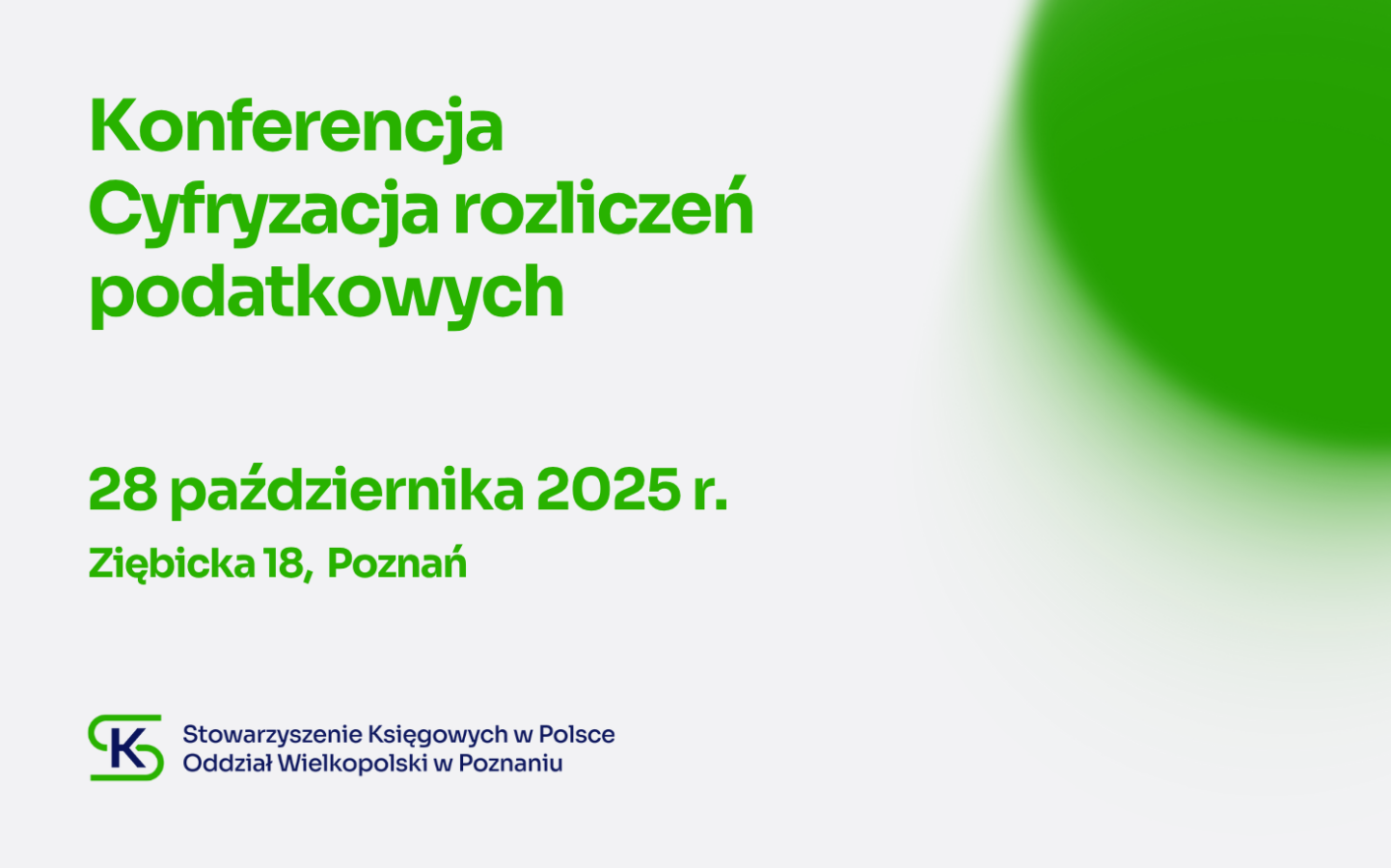 Serdecznie zapraszamy na stacjonarną konferencję „Cyfryzacja rozliczeń podatkowych”, która odbędzie się 28 października 2025 r. o godz. 15:00 w siedzibie Stowarzyszenia Księgowych w Polsce - Oddział Wielkopolski w Poznaniu, przy ul. Ziębickiej 18.