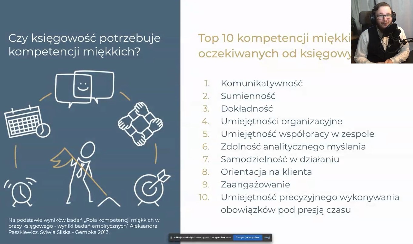 Z pewnością przeprowadzone w Klubie spotkanie uświadomiło nam wszystkim Dyplomowanym Księgowym, że posiadanie szeroko rozwiniętych kompetencji miękkich, ostatnimi czasy stało się kluczowe, a w sytuacji obecnego kryzysu, wręcz krytyczne (szczególnie jeśli chodzi o empatię i zdolności negocjacyjne). W celu ich lepszego rozwoju, warto wykorzystywać dostępne innowacyjne metody nauczania oraz nowe technologie.