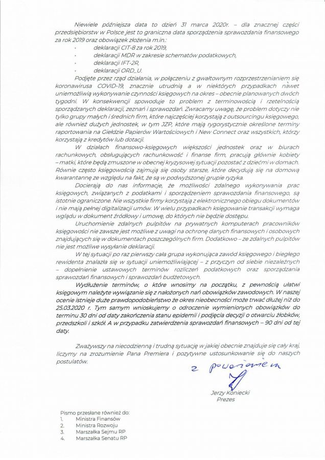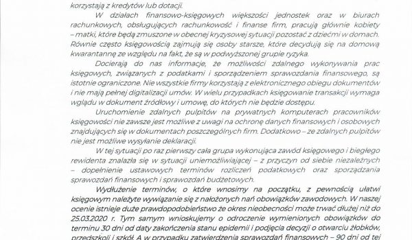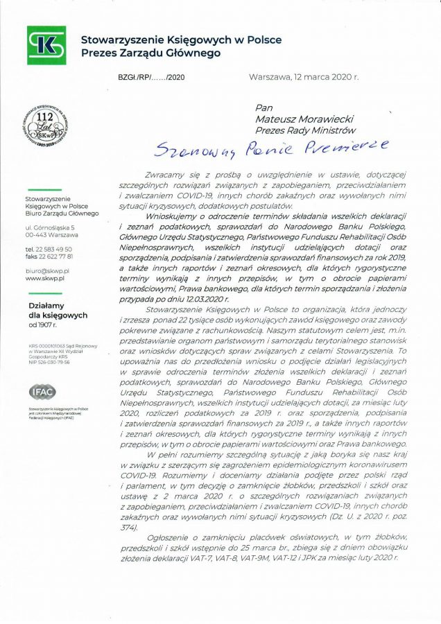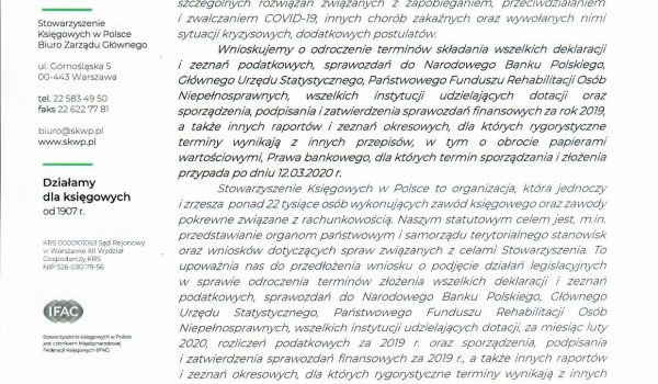 Stowarzyszenie Księgowych w Polsce wnioskuje do Prezesa Rady Ministrów, Ministra Finansów, Ministra Rozwoju, Marszałka Sejmu RP i Marszałka Senatu RP, o odroczenie terminów składania m.in. wszelkich deklaracji i zeznań podatkowych, obowiązkowych informacji, a także sporządzania i podpisywania sprawozdań finansowych.