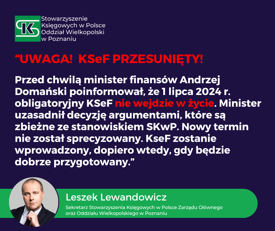 Przed chwilą minister finansów Andrzej Domański poinformował, że 1 lipca 2024 r. obligatoryjny KSeF nie wejdzie w życie. Minister uzasadnił decyzję argumentami, które są zbieżne ze stanowiskiem SKwP. Nowy termin nie został sprecyzowany. KseF zostanie wprowadzony, dopiero wtedy, gdy będzie dobrze przygotowany.