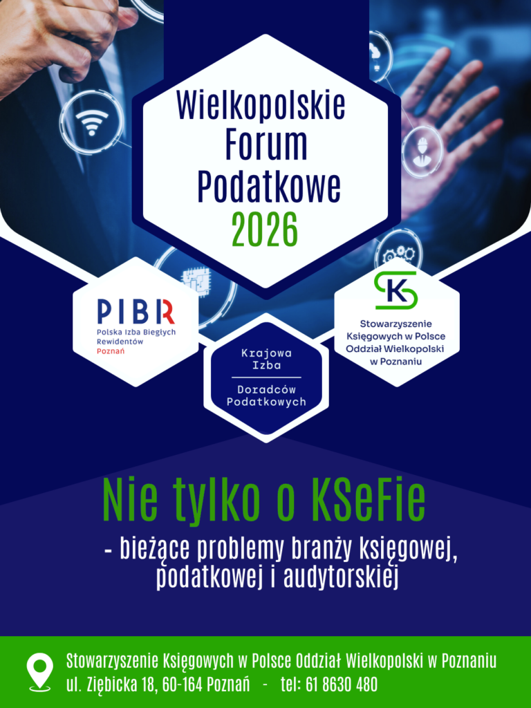 Stowarzyszenie Księgowych w Polsce Oddział Wielkopolski w Poznaniu zaprasza na Konferencję „Wielkopolskie Forum Podatkowe 2026”, która odbędzie się 10 marca 2026 r. w Poznaniu.
